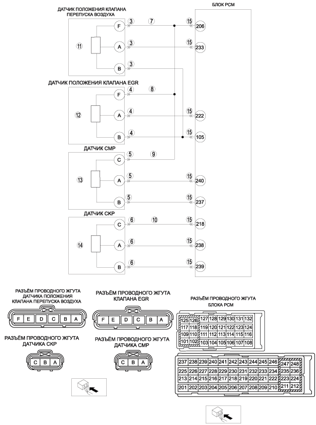 • The PCM monitors the input signal from EGR throttle valve position sensor or air bypass valve position sensor or CMP sensor or CKP sensor. If the voltage from EGR throttle valve position sensor or air bypass valve position sensor or CMP sensor or CKP sensor is less than 0.25 V, the PCM determines that there is a malfunction in the EGR throttle valve position sensor circuit or air bypass valve position sensor circuit or CMP sensor circuit or CKP sensor circuit.